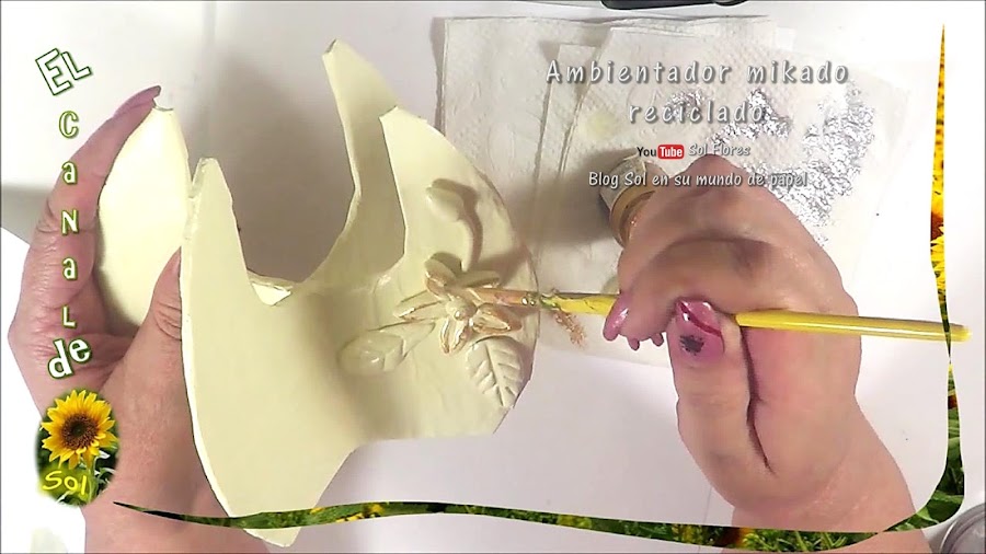 para obtener el color que yo quería mezclé pintura blanca, un poco de amarillo y un poco de café, y pinté la pieza varias veces hasta cubrir el papel, ya seca la pintura le puse pintura dorada con pincel seco también como manchones, pero solo en la flor y las hojas y en las orillas de la base,