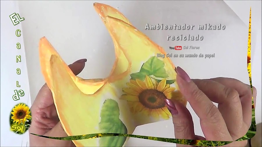 y en el centro pegué flores de servilletas, ya seca la servilleta manché también en color anaranjado y marqué las orillas, luego le di dos capas de barniz,