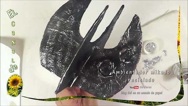 luego pegamos con silicón caliente, para las hojas hice una especie de abanico con 3 hojas y también lo pegué con silicón caliente, pintamos y dejamos secar para luego pasar pincel seco con pintura plateada metálica y aplicar barniz