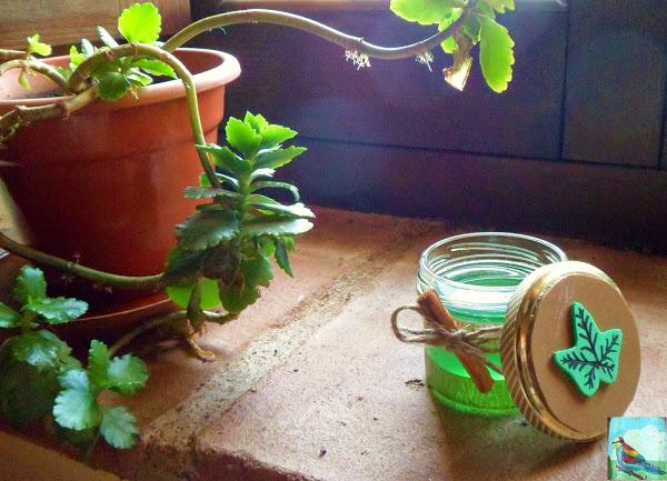 Para éste, que he querido hacer con un diseño más natural, he usado washi tape (simulando madera), canela en rama e hilo de cáñamo para decorar el cristal, y goma eva (marrón y verde), más washi tape (en colores ocres) y rotulador permanente para la tapa. Para el dibujo de la hoja me he ayudado marcando en la goma eva con un cortador de galletas, simplemente apretar y queda marcado. Después de recortar y pegar con silicona, le he pintado las nervaduras de la hoja con el rotulador permanente.