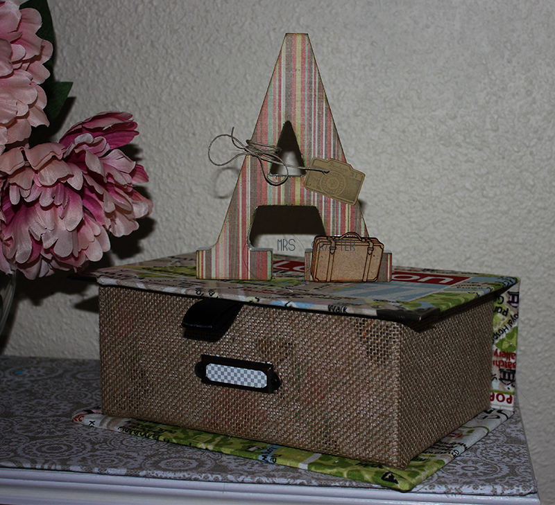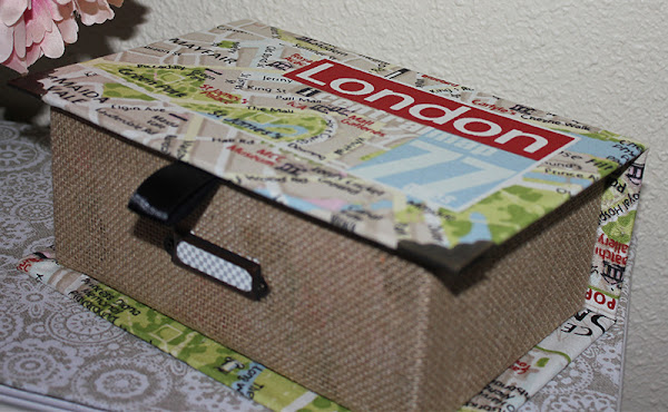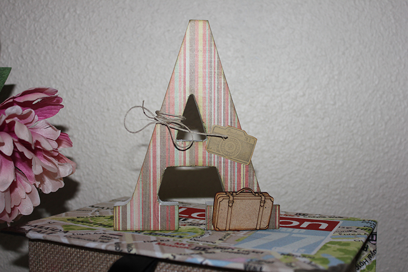 Un par de detalles que marcharon a Gandía. Son un regalo de "amiga invisible", para una chica muy viajera, además de aficionada a la fotografía.Así, caja libro con arpillera y tela del plano del metro de Londres y en su interior, letra A forrada en paple y decorada con troquel de maleta y sello de cámara de fotos.