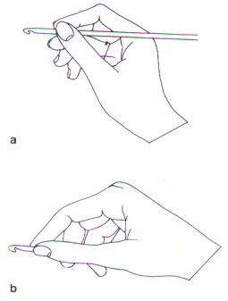 Antes de explicar estos puntos, es importante saber cómo coger el hilo y la aguja. Existen dos formas dentomar la aguja: como cogerías un lápiz (a), o como cogerias un cuchillo (b), como se muestra en la imagen. En ambas posiciones el gancho debe estar mirando hacia nosotras y no al revés.
