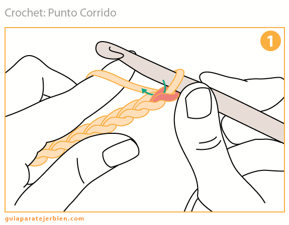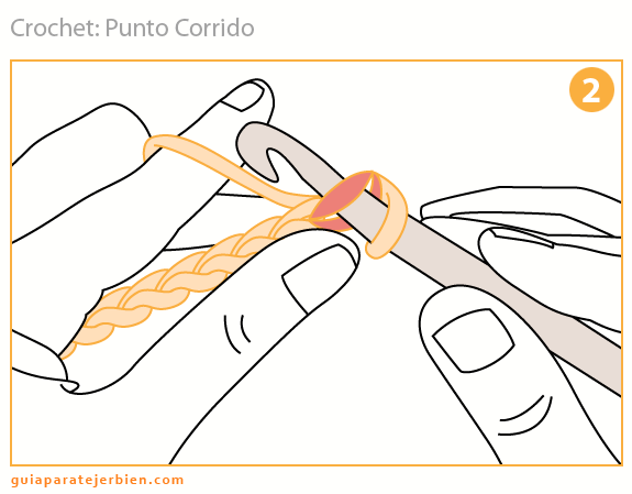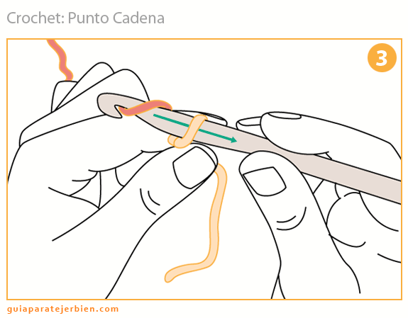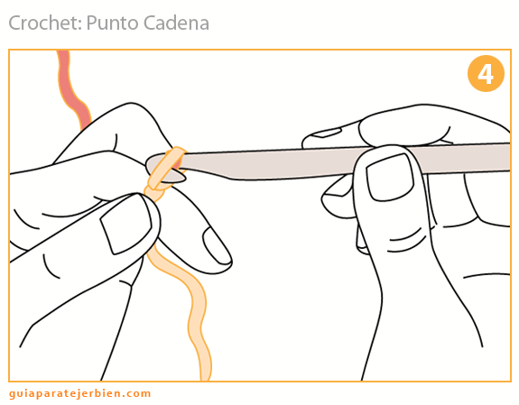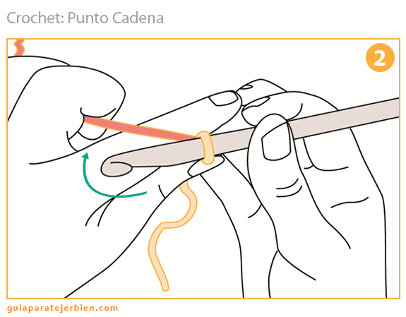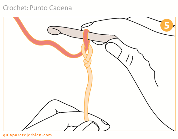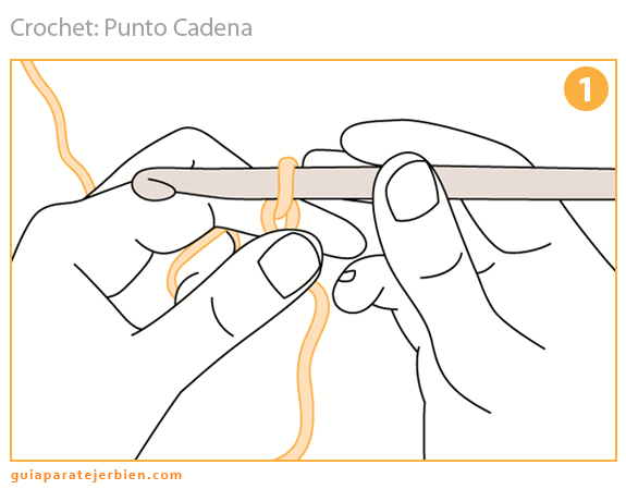 Suele utilizarse para empezar a tejer cadenas en crochet. En los dibujos se muestra el hilo en dos colores para diferenciar más facilmente el movimiento ha realizar. El tono más oscuro corresponde al lado del ovillo.