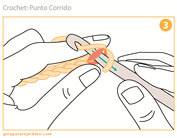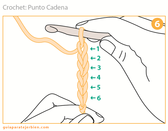 Repetir desde el paso número 2 hasta tener una cadena del largo deseado.En las explicaciones de otros puntos, al comenzar la primera hilera se indica insertar la aguja en un determinado punto cadena desde la aguja, la manera de contarlos es como está representado en el dibujo, no se incluye el nudo corredizo del final ni el punto que sostiene el ganchillo.
