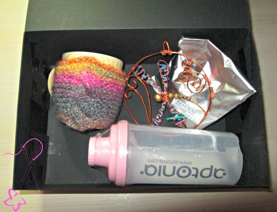 Así que le regalé una botella de batidos para deportistas, un reloj de gona azul, un atrapaluz y una taza con fundita invernal de ochos, estos dos ultimos los hice yo!