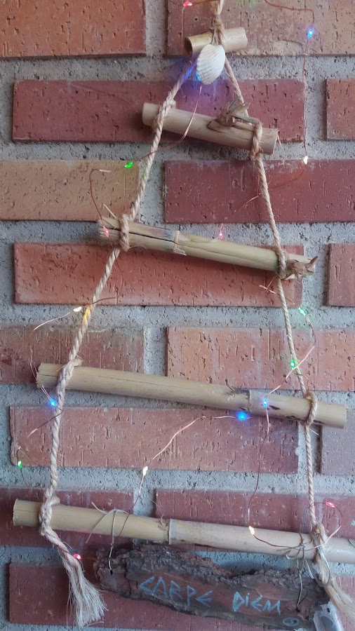 Un precioso arbol navideños, hecho con cañas, cuerda y abajo una frase muy alentadora. Me encanta M. José.!!!