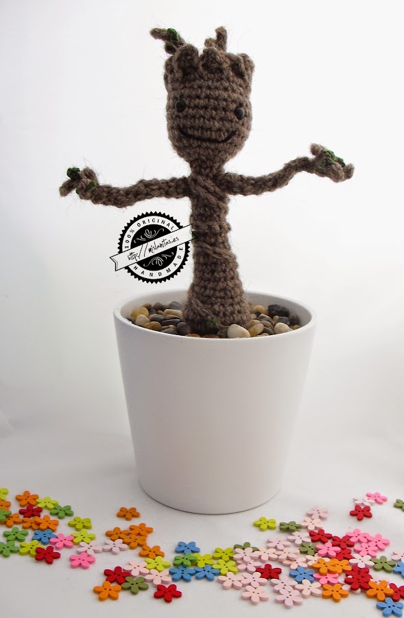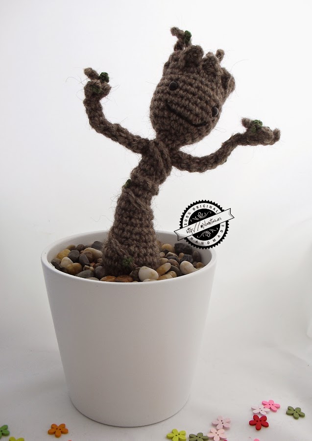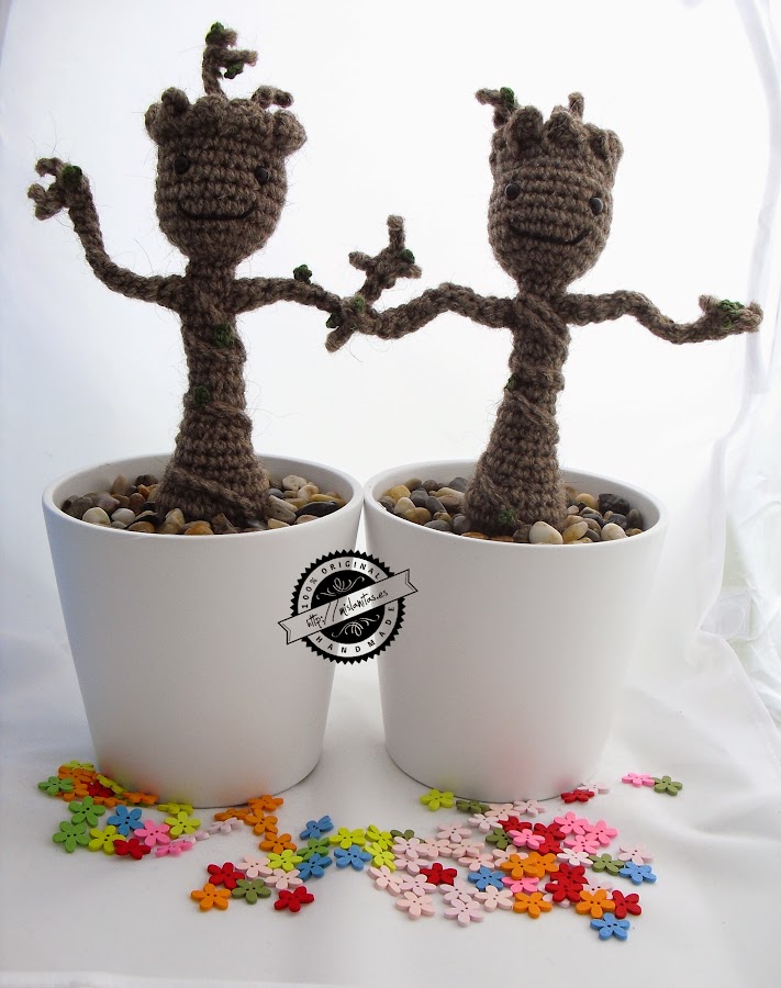 Lo he tejido con una lana tipo tweed mezcla de acrílico, lana virgen y alpaca, que para mi desgracia, está descatalogada (se teje genial). Una amiga se enamoró de él nada más verlo (aún estaba sin "plantar" en la maceta", maceta que costó encontrar, 5 tiendas recorrí. Nunca pensé que costaría tanto encontrar una simple maceta blanca...) y por suerte, quedaba suficiente ovillo para tejer su gemelo (sobraron 10 cm, sudaba en los últimos puntos por si no alcanzaba jejeje)