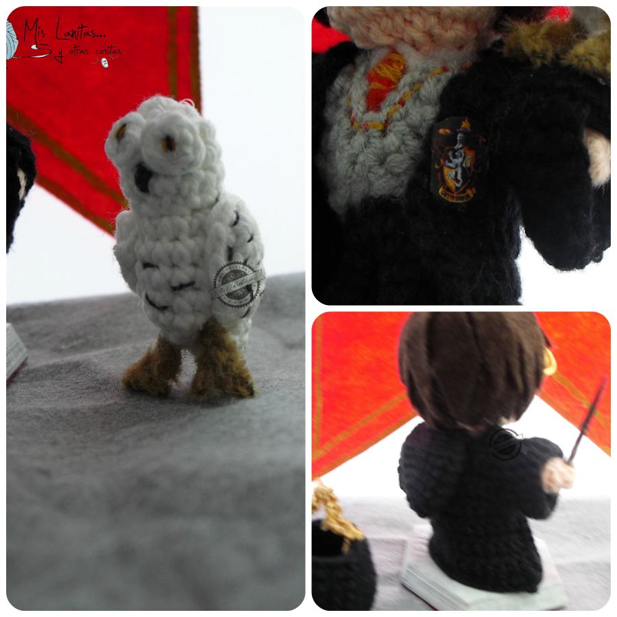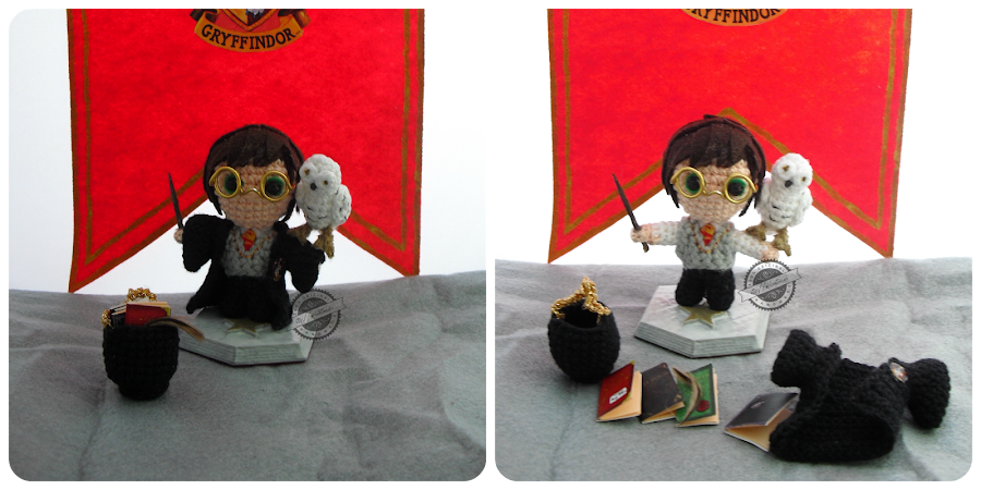 Mide sólo 8 cm sin contar la base, he disfrutado muchísimo tejiéndole los detallitos. Para que quedara mono en las fotos, le hice un estandarte de la casa Gryffindor, para ponerlo en situación, con su caldero lleno de libros de texto, pociones, encantamientos,... y no puede faltar el quidditch. Me ha llevado tiempo pero ha merecido la pena. Pena de fotos pero estaba nublado cuándo las hice.