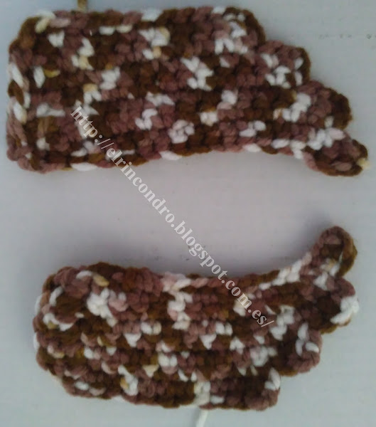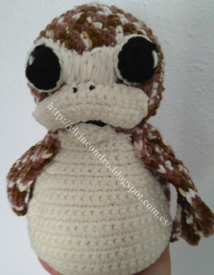 Aquí os dejo el patrón, el cuerpo es todo en lana marrón, encontré una que hace varios tonos de ese color pero hay un montón de combinaciones y si no os convenze siempre se puede hacer en un color liso. Y los detalles en blanco y negro.El ganchillo es del 4 y la lana pone que para 3 1/2 o 4.