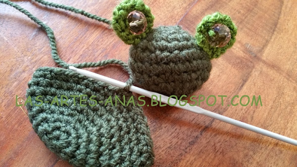con 2 tonos diferentes de verde y cuentas de cristal como ojos