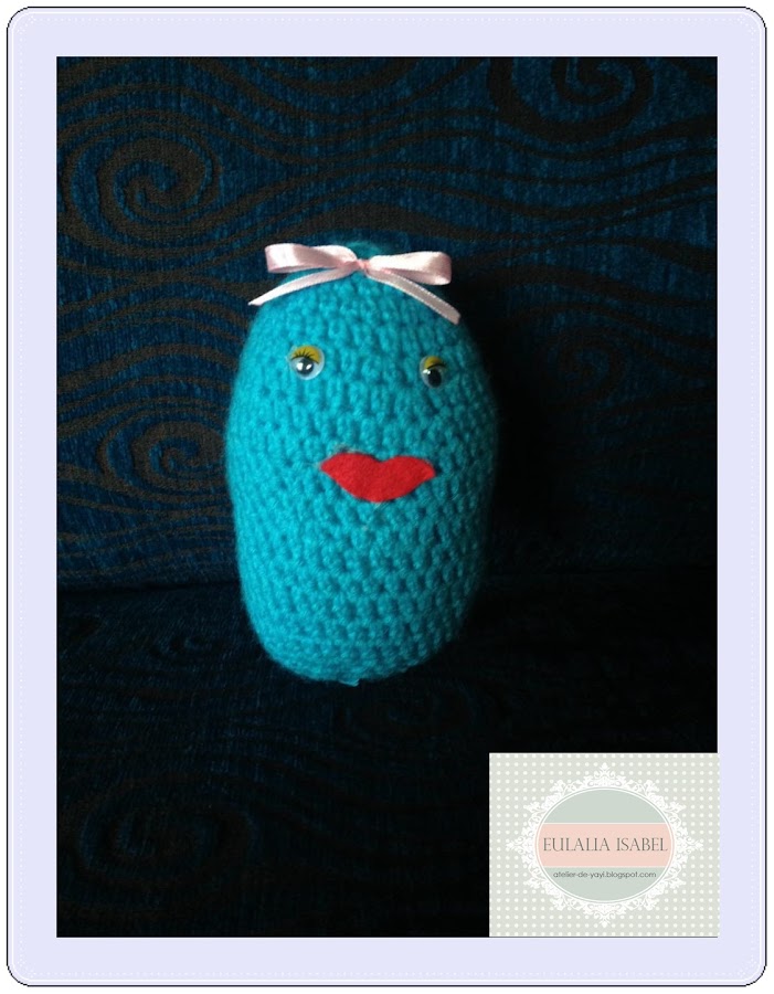 Intentando hacer amigurumis , este se llama LA COQUETA TURQUEZA, se ha pintado los labios de un rojo fuego, y coqueta con su lazo rosado, pero sus ojitos son inocentes,,,,,,,,,,,,
