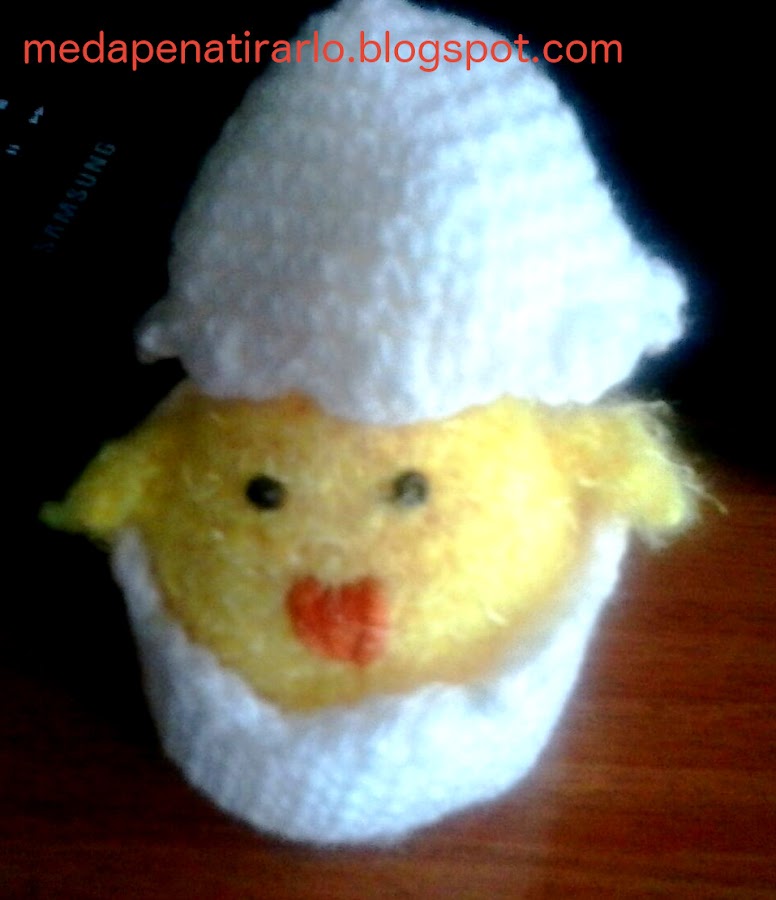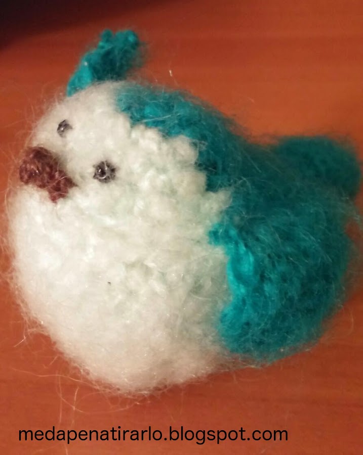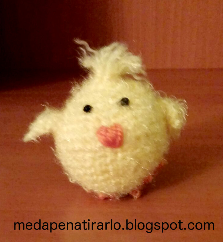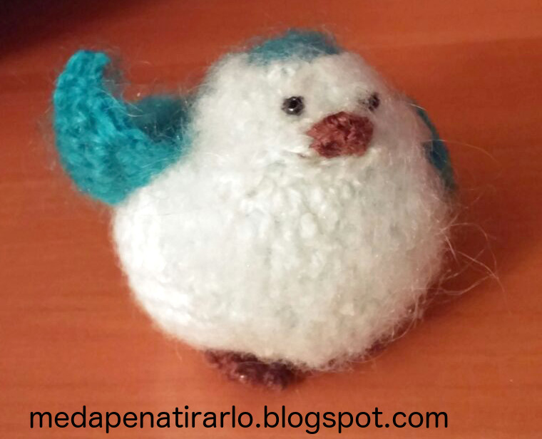 Creo que fue mi primer amigurumi; se lo regalé a mi amigo Toni y a su madre. Quedó gracioso porque la lana es pelusilla y da el efecto pluma. Ahora bien, las patas, aunque en el patrón original son de ganchillo, creo que es mejor hacerlas de fieltro.