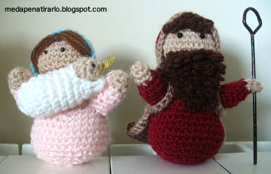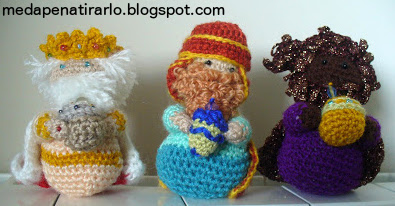 Utilicé derivaciones de este patrón, aunque hay otros en la red; todos bastante parecidos, la verdad. Esto sí que es bastante laborioso porque aunque las figuras son redondas y pequeñas, hay que dedicar mucho tiempo a ensamblar todos los bracitos y ropita y coser las cuentecitas. Como utilicé lana de distintas calidades y grosores y nunca me acordaba de la aguja que usaba para todo, las figuras me quedaron de distintos tamaños (unas más gordas que otras), pero en conjunto quedó gracioso. Metí piedras junto a la napa para que quedaran derechas, sin resultado demasiado estable: si vuelvo a hacer alguno para mí (creo que sólo de los Reyes Magos, que son lo mejor del conjunto), meteré lo que os digo de la cápsula de plástico rellena de algo pesado.