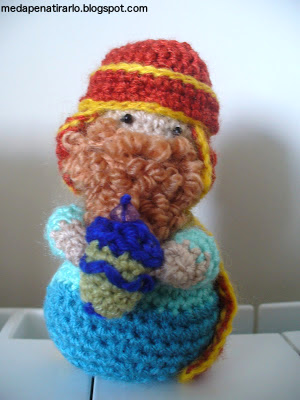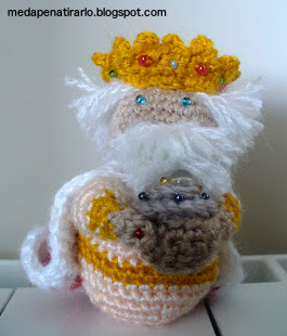 Melchor: la corona cuajada de piedras preciosas y el anillo de rubíes no disimula su aspecto de científico loco de raza aria. La capa roja bordeada de armiño no disimula que me equivoqué utilizando un ganchillo más pequeño que para el resto y se quedó pelín pequeño comparado con el resto de figuras, pero puede ser por la edad.