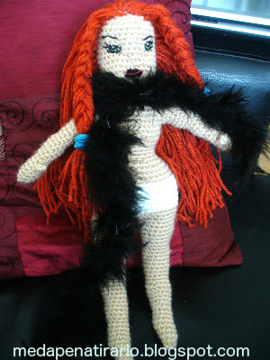 Lo malo es que le quise poner un pelo tan largo que ahora se le cae para atrás la cabeza (y eso que le robé parte de él para acabar una línea de la manta de ganchillo, pero dio igual porque tuve que buscar lana parecida para acabar el tramo). Los rasgos (hechos con tela pintada e hilo) le quedaron como de mala leche. El vestidito y las sandalias son improvisadas y la boa de plumas la saqué de vete tú a saber de dónde. Lo peor de todo es que sólo con niños en casa le sacas poco provecho, tú espérate que no la acabe regalando...