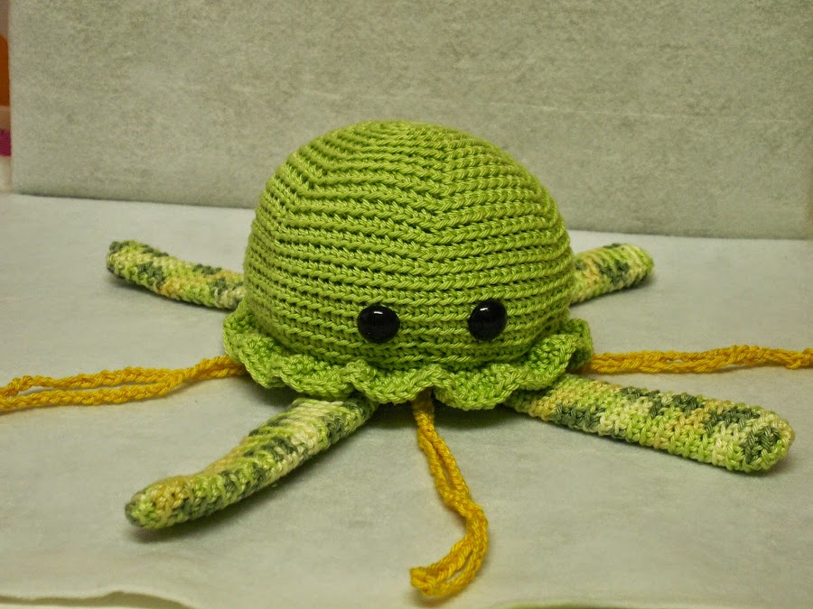 Este fue el primero que hice, una medusa, en la que combiné verde liso para el cuerpo con amarillo y verde matizado para las paras.