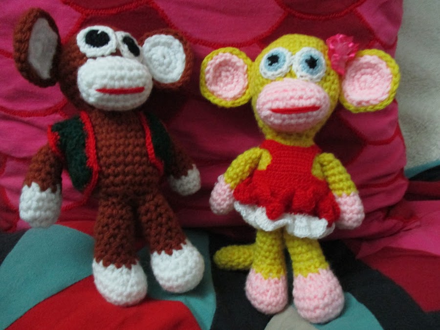 ESTOS MONOS LOS REALICE CON EL PATRON DEL MONO LLAVERO, PERO UTILICE UNA AGUJA DE CROCHET NUMERO 5 Y UNA LANA MAS GRUESA, ADEMAS LOS VESTI E HICE CON COLORES DIFERENTES, NO COMO EL LLAVERO QUE ES TODO DEL MISMO COLOR, COMO SON PARA NIÑOS LOS REALICE TODO DE LANA O SEA TEJI LOS OJOS EN LUGAR DE PONERLES ABALORIOS U OTRA CLASE DE OJOS QUE PUEDENFAYAR Y PERDER SU SEGURIDAD, ESTAN TODAS LAS PIEZAS COSIDASPOR LO QUE NO SE PUEDEN DESPRENDER Y ACASIONAR ALGUN PROBLEMA, ESPERO LES GUSTE Y LO HAGAN. GRACIAS POR SU VISITA.