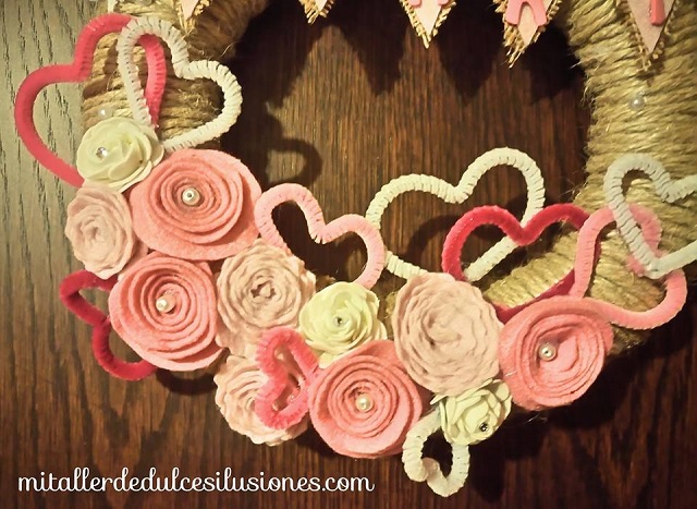 6. Pegáis todas vuestras decoraciones en la corona ,donde más os guste,sacar vuestra imaginación a pasear que siempre es divertido.Yo he añadido una guirnalda de banderitas decoradas con arpillería,fieltro y encaje y donde he puesto la palabra que más me gustaba,la pegáis también ,ponéis una lazada arriba y fin,ya tenéis lista vuestra corona de San Valentin ,para la puerta o cualquier rincón que os guste.Sabéis a mi me parece monísima con el nombre de una niña para la habitación de nuestras peques.