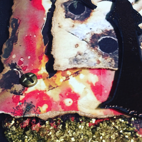 Utilice pasta de textura dorada que después volví a tapar con gesso negro y que al darle la cera metálica de Finnabair se vislumbra un poco, pero no tan bestia como al principio.