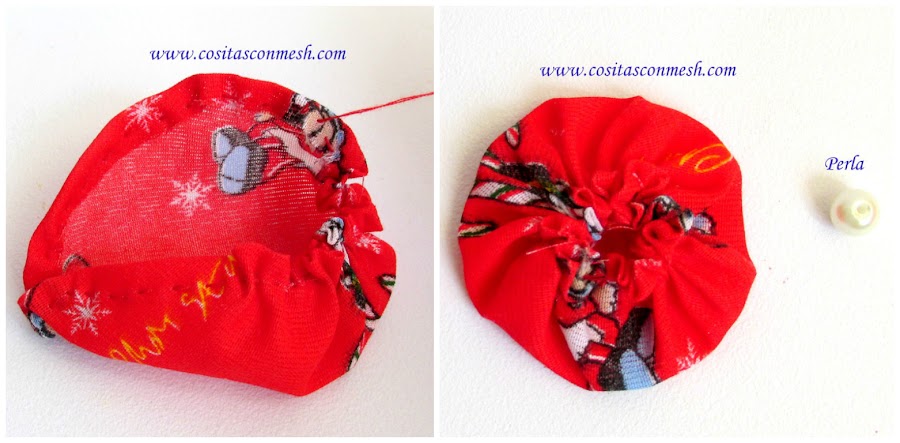 2.- Luego jalamos el hilo del hilván que hicimos, y fruncimos dirigiéndolo hacia el centro, acomodamos con el dedo para que el yoyo quede bonito.