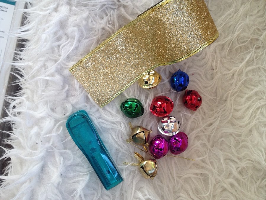 Para ello vamos a necesitar: cinta de regalo, cascabeles o abalorios grandes para la cabeza, una grapadora, y pegamento o pistola de silicona.