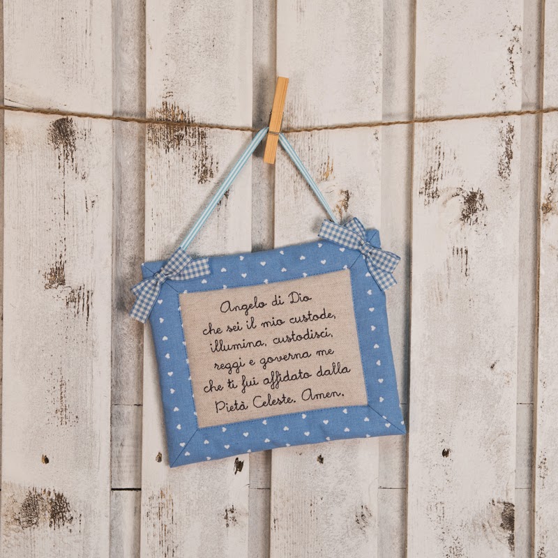 Dei nuovi regali per i bebè, un sopraculla con ricamata la preghiera dell"angelo custode.