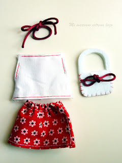 Quereis verlas vestidas??? ahí van!!!! La ropa también está completamente cosida a mano, con telas de distintos dibujos y colores, además llevan complementos; la conejita lleva un bolso blanco que cierra con un lazo granate a juego con el que lleva en la oreja, una falda roja con flores fruncida en la cintura y una blusita blanca con bordados en rojo y la mapache lleva un bolso azul largo con cordón azul y un lazo azul que cierra por la parte de atrás con velcro, el vestido me encanta! es azul con unas hojitas en blanco lleva todas las costuras bordadas en rosa y un cinturón de cuero rosa que se sujeta con dos presillas de hilo de algodón también en rosa, más guapas no pueden estar!!!!