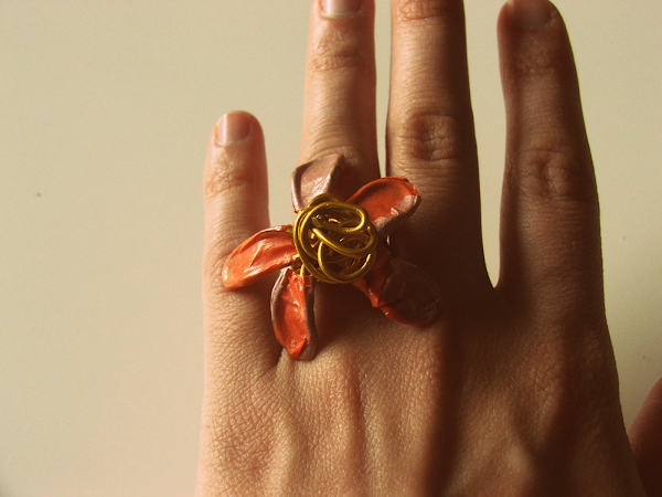 Do you like it? It"s very easy to make. First I made the shape of the ring with the wire, rolling it around and making a kind of flower with it. Once we"ve done that, we have to put a little bit of Styl Patch with a brush on the petals and we stick the paper on each petal. Then we put some more Styl Patch on the paper, to make it shiny. Easy, right? I think I"ll make some more to show you the result!
