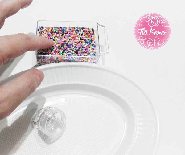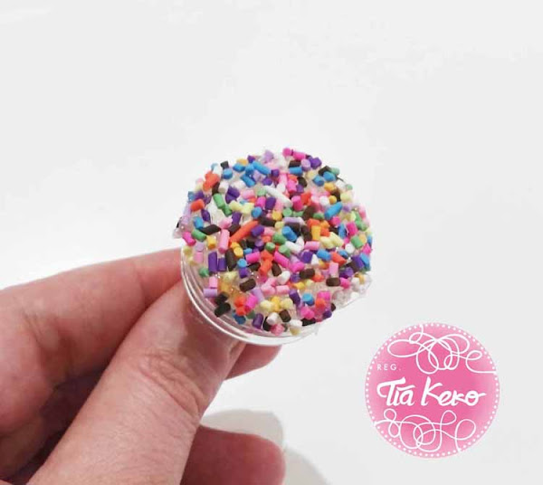 Ahora tenemos que decorar la cajita pegada a la base del anillo, nosotras utilizamos un poco de virutas de pasta de modelar que teníamos por casa, para que de esta forma pareciera una caja dulce y colorida.