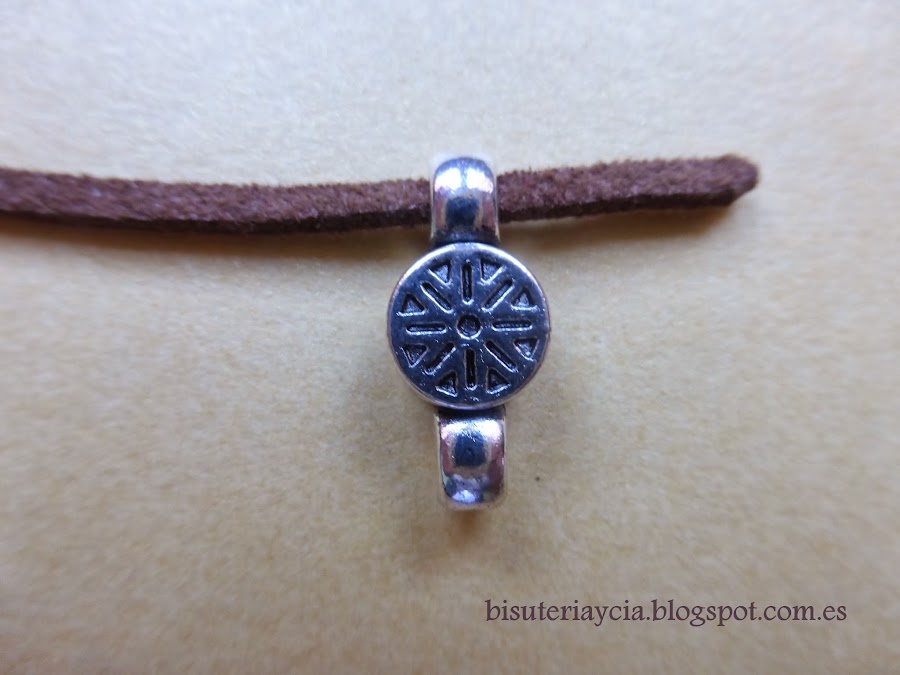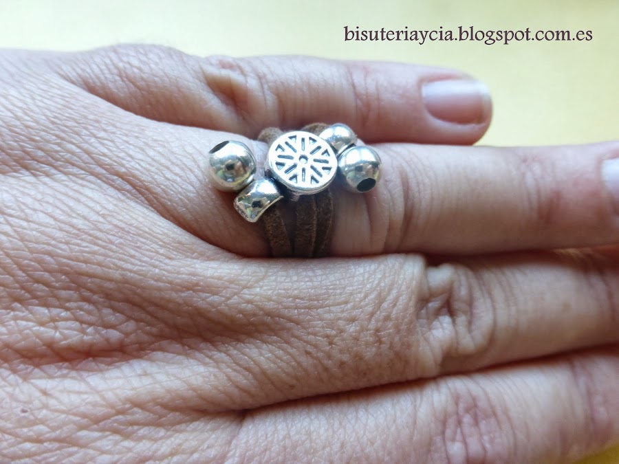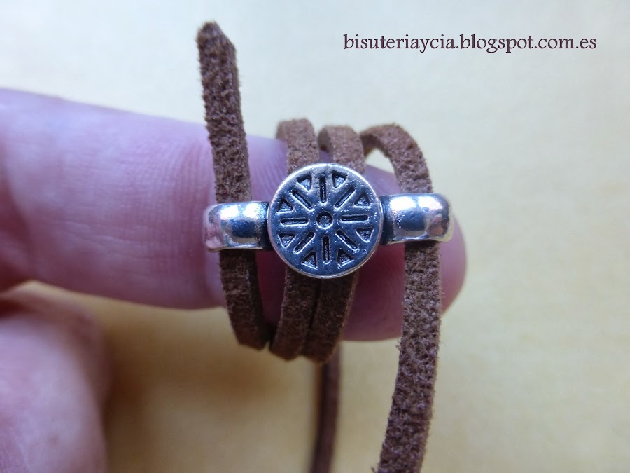 Empezaremos cortando un trozo de antelina, lo suficientemente largo como para darnos cuatro vueltas al dedo. A continuación pasaremos la antelina por la primera salida de la pieza metálica.