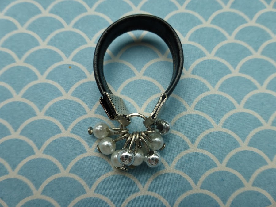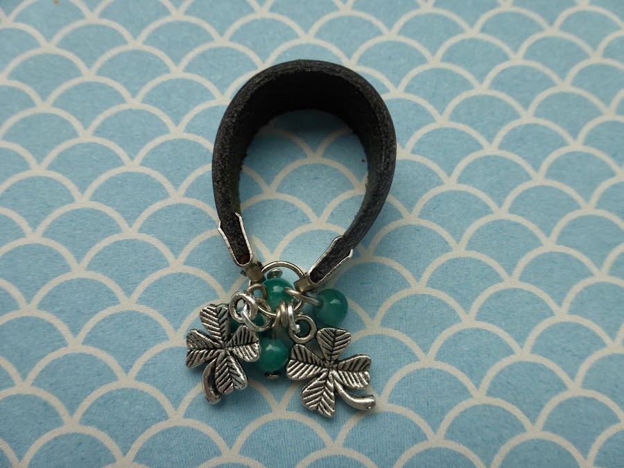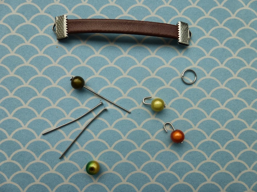 En la imagen podéis ver el trozo de cuero con los terminales y como debéis doblar las agujas, una vez colocadas las bolitas en la anilla grande debéis acabar de cerrar la anilla.