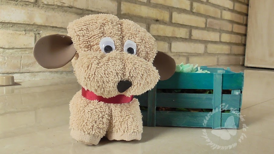 Lo aconsejable para estas figuras es que la toalla sea cuadrada, como por ejemplo 30 X 30 cm, misión imposible encontrarlas. Yo he utilizado unas toallas faciales de 30 x 45 cm que creo son el tamaño estándar. Así que os aconsejo que no os volváis locas buscando una toalla cuadrada. La más mañosa siempre puede recortar una y hacer de nuevo las orillas. Para el perrito no me fue mucho problema que la toalla no fuera cuadrada, pero para el búho si que os lo aconsejo, pero ya veis que sale igual.