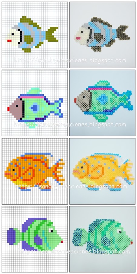 Primero empezaremos por mostraros los animales submarinos que podemos realizar mediante placas normales, cuadradas o redondas, de Hama Beads. Para ello os proponemos estos diseños: