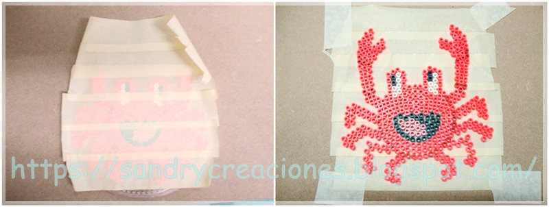 Tras esto, como el dibujo transparenta por la cinta de carrocero, iremos realizando el dibujo con los Hama Beads Midi, pegándolos en la cinta de carrocero. También es posible hacerlo con plástico transparente adhesivo como hicimos con la estrella naranja.