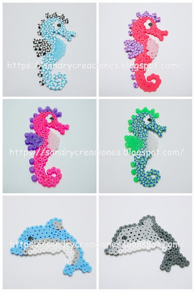 Solo hay que cubrir la placa con los colores de Hama Beads que queramos y tendremos el animal o forma en cuestión sin muchas complicaciones. En nuestro caso utilizamos placas con forma de caballito de mar y de delfín para realizar diferentes modelos de cada uno: