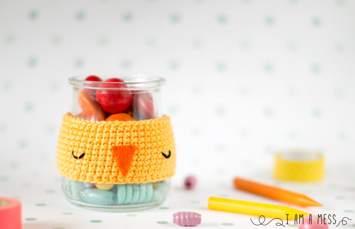 Mi propuesta ganchillera es apta para novatas e impacientes. Se hace rápido y queda mono: ¡tenemos ganador! Obviamente, todo depende del tamaño de tu bote. Si usas una damajuana olvídate de lo de rápido -pero quedará mono igual-. Yo me he ido a la mínima expresión de bote de cristal y he usado vasitos de yogur.