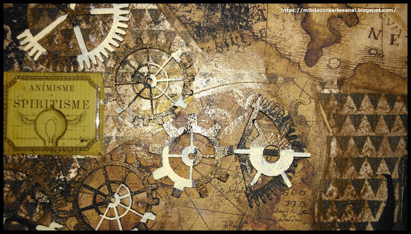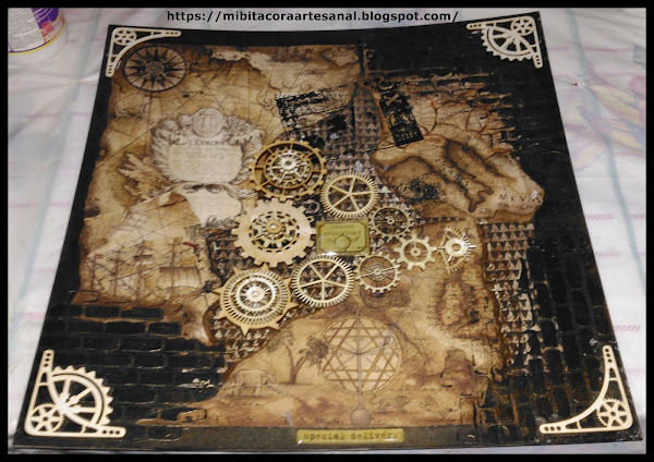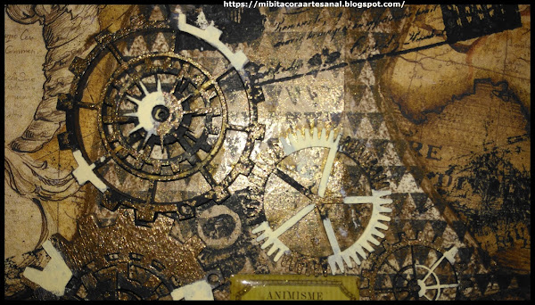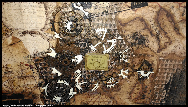 los engranajes me fascinan, seña de identidad del estilo Steampunk, comienzo a jugar con ellos hasta conseguir un diseño que me guste, además, utilizo dos etiquetas, claves que daran nombre a mi proyecto, de la colección "Mechanical Illusions" de ScrapBerry´s