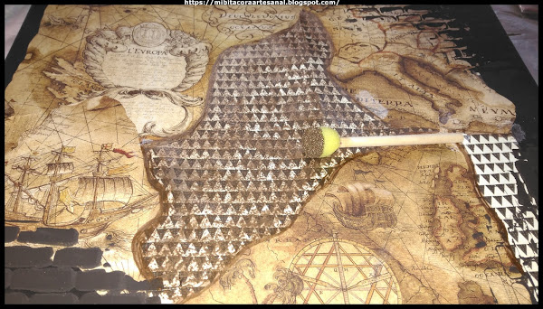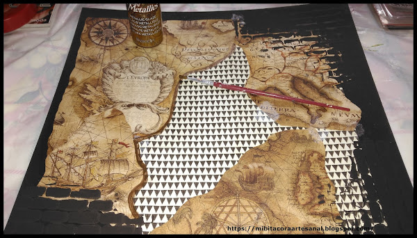 integro los papeles con esmalte metálico de DecoArt color Renaissance Brown para acentuar el efecto antiguo del papel principal