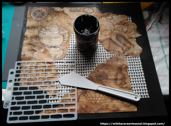 comienzo a dar textura utilizando una plantilla con motivos de ladrillos y Gesso Negro DecoArt Media