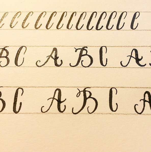 Aquí mi primer ejercicio de ese curso de iniciación a la caligrafía (que mejor no recordar demasiado). Yo había cogido una plumilla antes para dibujar pero esto tenía muy poco que ver y a la vista está que la cosa era "complicada".