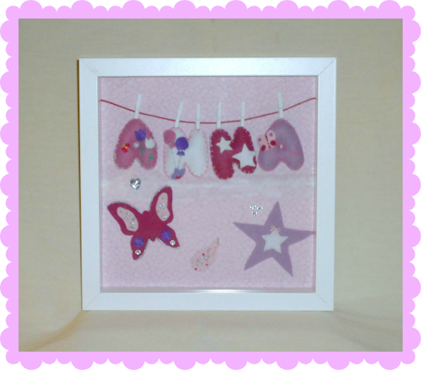 Su madre y amiga mía, Marta, me decía que tenía manga ancha para hacer lo que yo creyera, pero la conozco... y como yo, sabe muy bien lo que le gusta, cómo le gusta y en qué cantidad. Así que esta vez el cuadro no es sorpresa, porque lo hemos ido diseñando juntas. No se aprecia bien, pero el fondo es de la misma tela que Marta le hizo unos cojines en la habitación de Anna y en la mitad he puesto una puntilla, que le da un toque romántico, pero que no se pasa.
