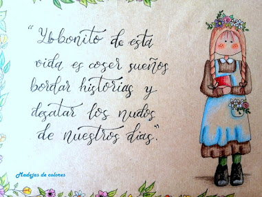 Me hubiera gustado haberlo pintado con acuarelas, pero es imposible con este papel, así que los hice con lápices de colores. Alrededor una cenefa formada con diferentes flores.