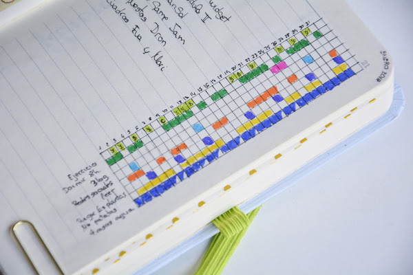 También me gusta poner en esta parte una pequeña tabla para hacer un traker. En el eje horizontal ponemos los días del mes y en el vertical lo hábitos que queremos controlar, tanto buenos como malos y vamos marcando en colorines los días que lo hacemos o no.