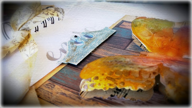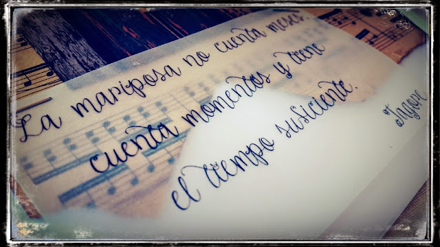 Encuadernación con anillas y una portada "limpia" con solo un foco de atención: una gran mariposa que en realidad son tres, trabajada en diferentes materiales y técnicas con tintas distress, tintas de alcohol... y volumen. Y una preciosa frase que no podía ser más adecuada para lo que quería transmitir.