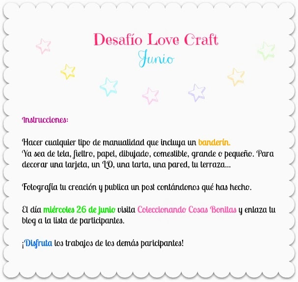 Ahora os informo que el pasado día 1 María de La cajita de música publicó el nuevo Desafío Love Craft de junio, en esta ocasión el elemento que tenemos que utilizar son los BANDERINES, os dejo con las instrucciones: