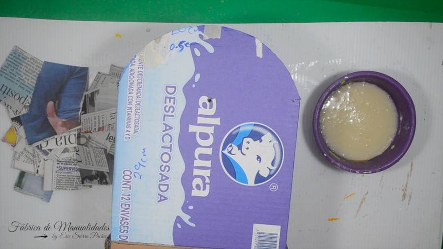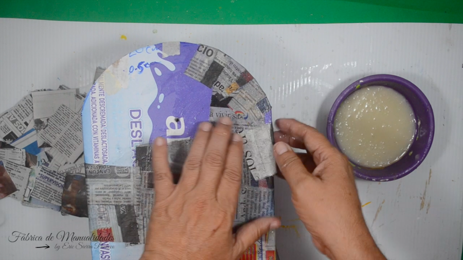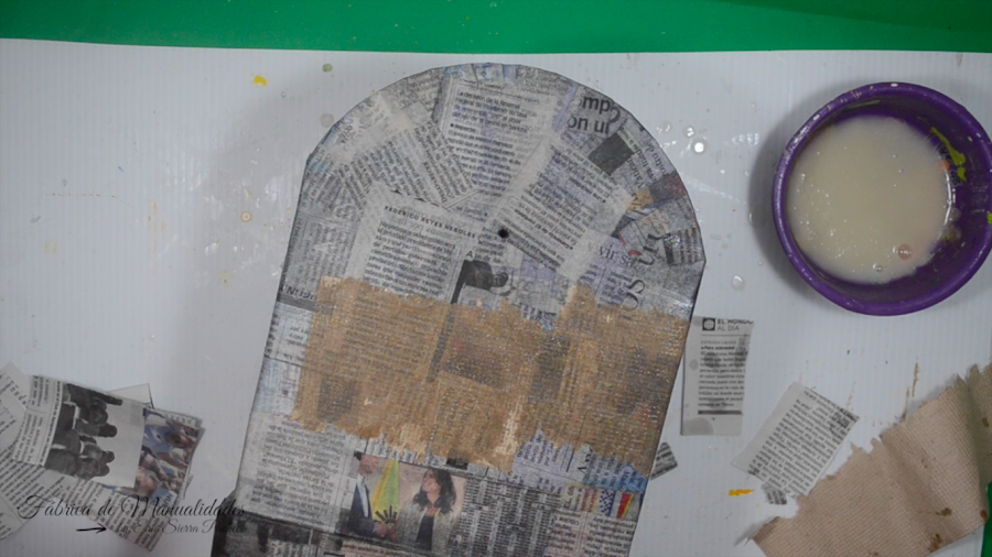 14. Le hacemos cartapesta a todo el trabajo usando papel de periódico y engrudo casero. Dejamos secar entre capa y capa.
