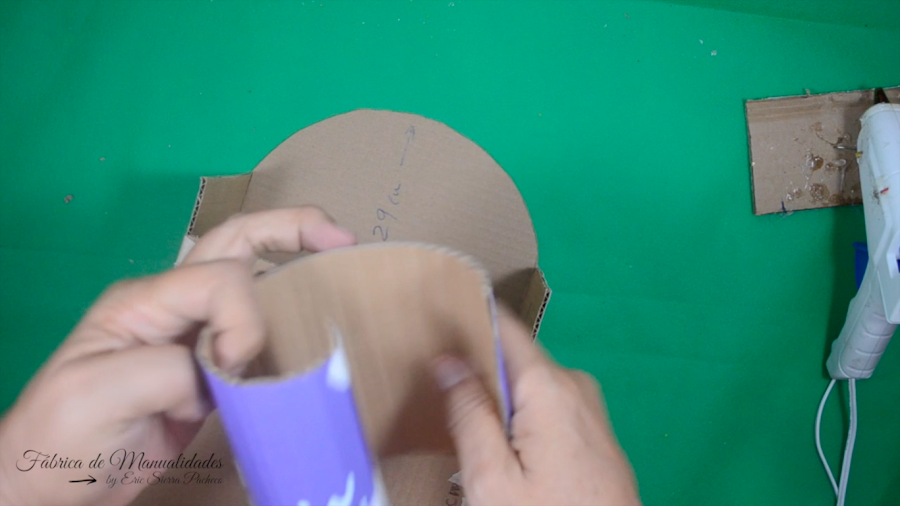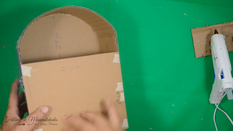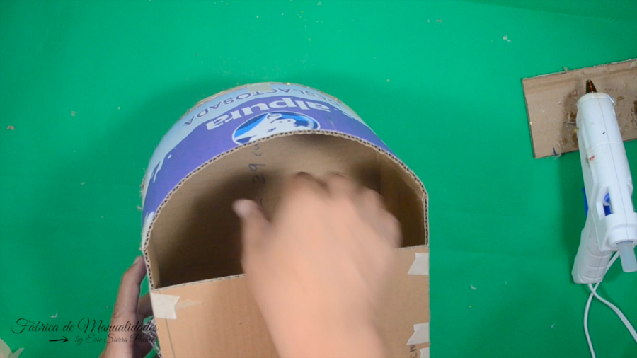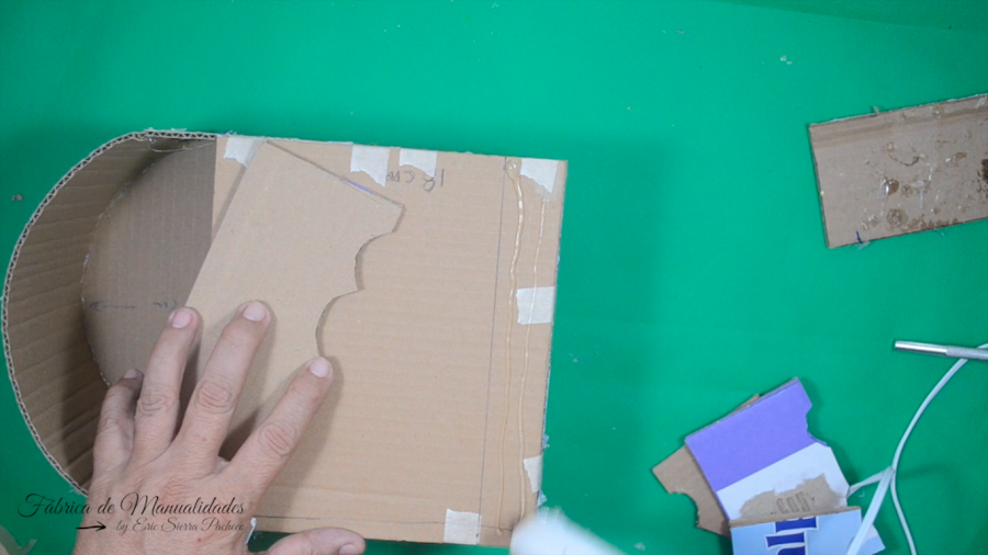 8. Pegamos el cartón, donde señalo, también usando silicón caliente y nos ayudamos de la cinta de papel.