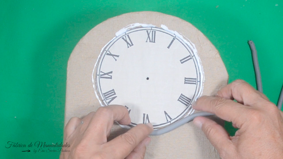 17. Pegamos un cordón grueso de porcelana fría alrededor de la carátula, usamos pegamento blanco.