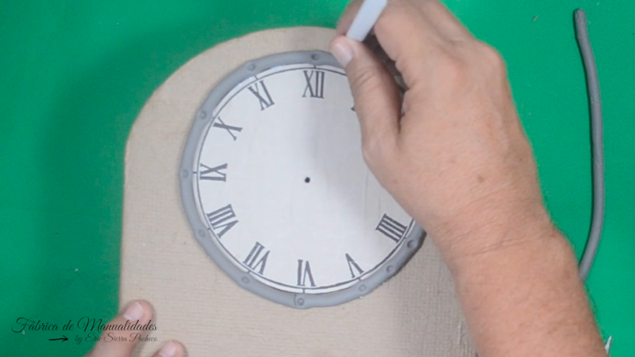 18. Con una herramienta que tenga una bolita en la punta le hacemos unos agujeritos donde están las horas y en la media también.