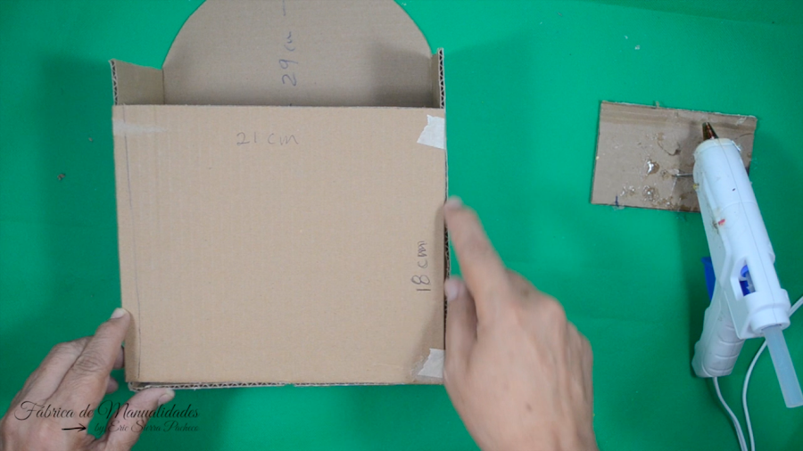 6. Cortamos un cartón que servirá de tapa por la parte de atrás; ésta mide 21 cm de ancho x 18 cm de altura. Pegamos con silicón caliente y nos ayudamos de la cinta de papel para fijar bien.